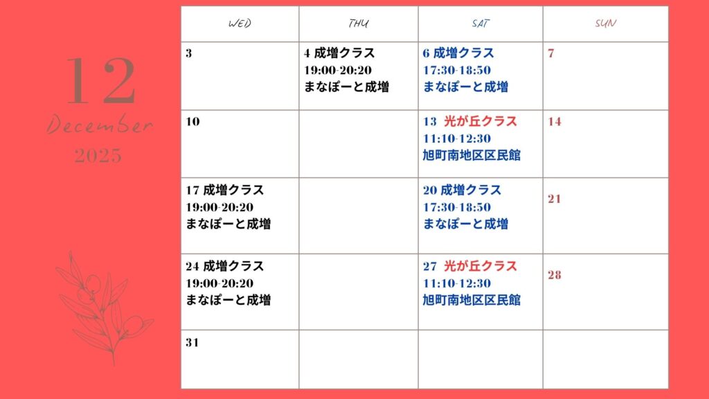 さて、12月の水曜日成増クラスが、イレギュラーとなっております。